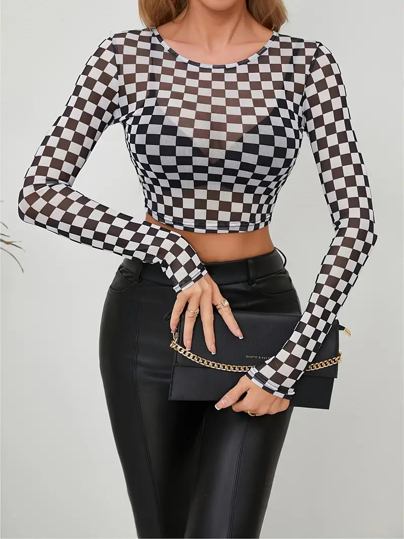 Introducing the checkered mesh shirt - a versatile, slim-fitting crop top for spring and fall. With its plaid print and mesh fabric, this shirt will elevate your wardrobe and keep you stylish. Plus, its crew neck adds a touch of playfulness to any outfit. (Put the "fun" in functionality with this shirt!)